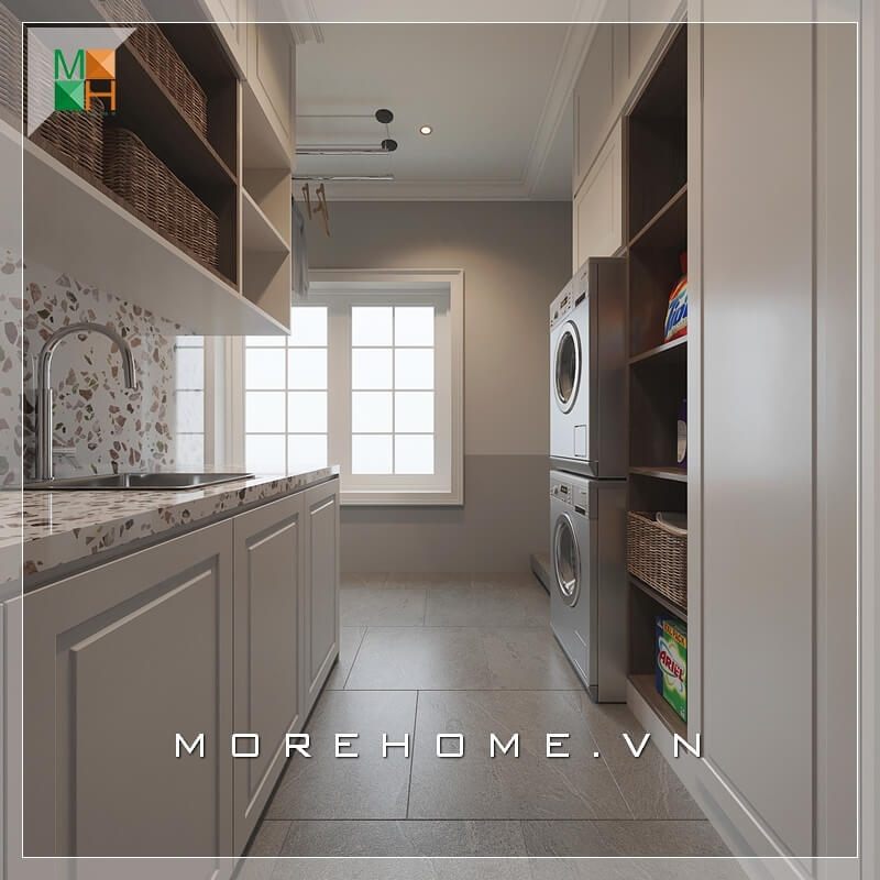 Thiết kế nội thất không gian bếp thay vì các mẫu tủ bếp cổ điển với nhiều chi tiết trang trí là thiết kế bếp hiện đại đa năng với thiết kế phẳng, sáng màu không tay nắm giúp không gian bếp được mở rộng và thông thoáng hơn.
