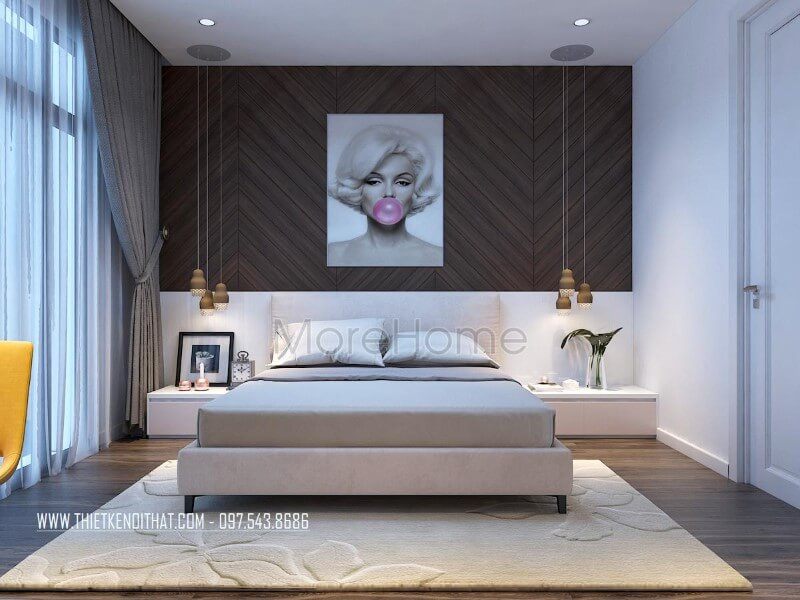 Giường ngủ gỗ óc chó hiện đại kết hợp cùng điểm nhấn tranh canvas trên nền gỗ ốp tạo nên không gian ngủ thư thái, đẹp mắt.