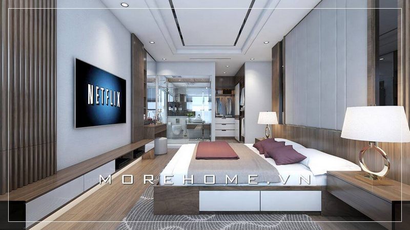 Mẫu thiết kế nội thất phòng ngủ CT4 Mỹ Đình hiện đại tiên nghi với hệ tủ quấn âm tường, giường ngủ gỗ cao cấp