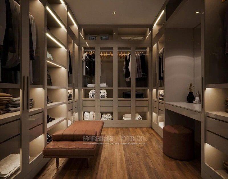 Tủ quần áo chữ U sử dụng hệ cửa kính trắng cường lực sẽ giúp bạn tìm thấy mọi thứ một cách dễ dàng