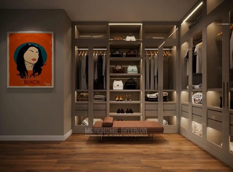 Tủ quần áo gỗ công nghiệp đẹp, sang trọng với thiết kế mở từ hệ thống cửa kính trong suốt sẽ lựa chọn thông minh cho phòng thay đồ.