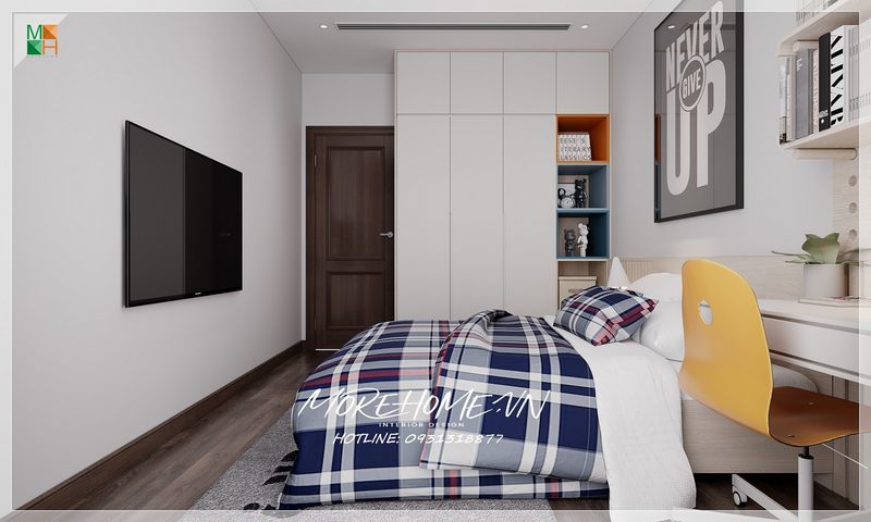 Với phòng ngủ diện tích nhỏ có thể áp dụng mẫu thiết kế tủ quần áo kịch trần cánh mở kết hợp kệ trang trí bằng gỗ công nghiệp, không chiếm nhiều không gian mà vẫn giúp bạn lưu trữ đồ đạc gọn gàng