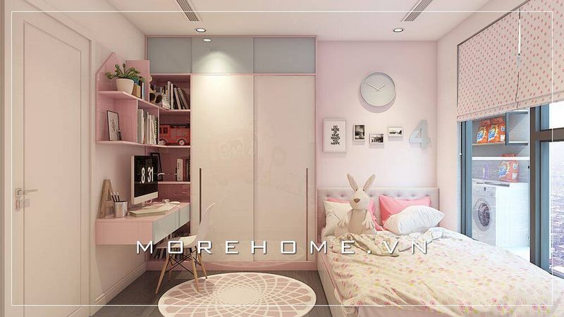 Trang trí nội thất phòng ngủ bé gái độc đáo và ấn tượng với mẫu kệ tủ quần áo trẻ em âm tường kết hợp bàn học đa năng hiện đại