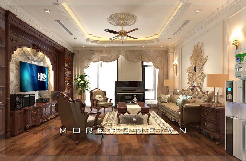 Trong thiết kế nội thất phòng khách biệt thự tân cổ điển, khéo léo được thể hiện qua những chạm khắc tinh xảo của trần nhà, kệ TV gỗ tự nhiên, vách tường của TV, lựa chọn rèm cửa và đèn chùm treo trần, tất cả đều được thiết kế tinh tế và điêu luyện.