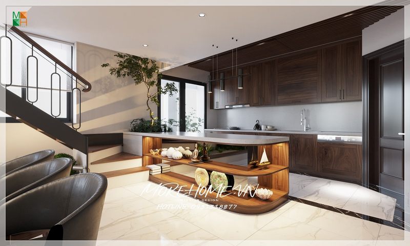 . Bàn đảo bếp mặt đá nhân tạo kết hợp với kệ trang trí gỗ tự nhiên sẽ giúp không gian bếp của bạn trở nên phong cách và sống động hơn, để bạn luôn cảm nhận được sự hứng khởi khi bắt đầu mỗi bữa cơm cho gia đình.