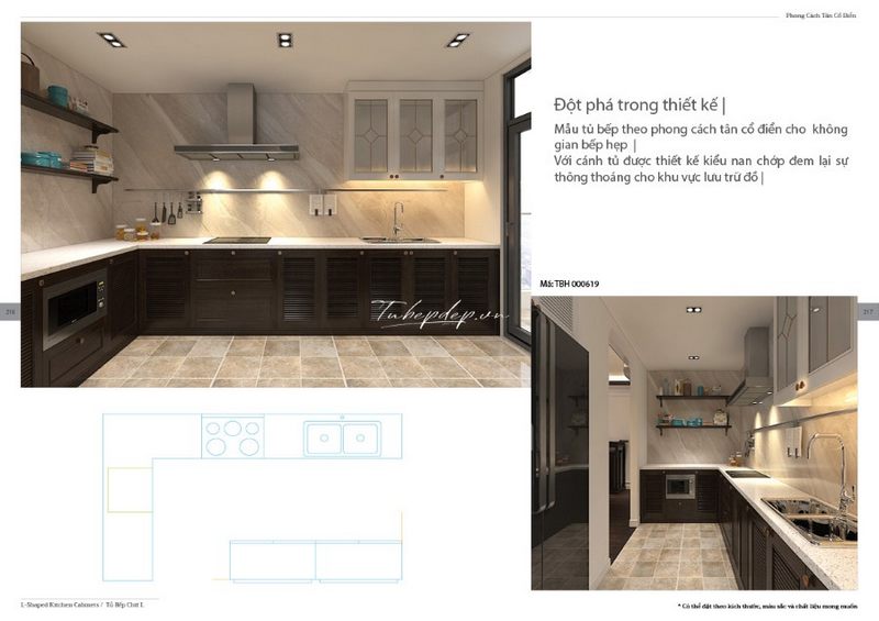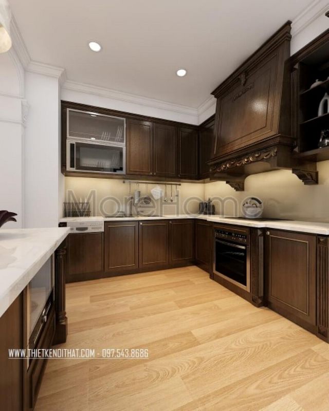 Mẫu tủ bếp theo phong cách tân cổ điển từ gỗ có chó có các nan chớp thông thoáng tiện lợi lưu trữ đồ đạc